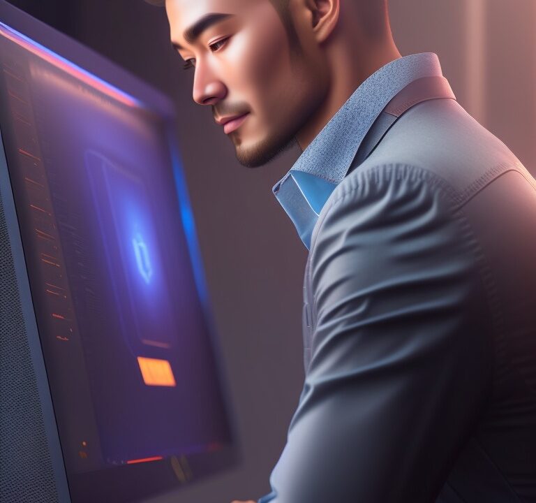 日本語訳:「AIを使う男。PCの前で過ごします。自然」